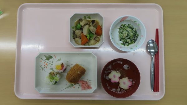 誕生会🎂行事食です。 ~ メニュー ~ 太巻き寿司 いなり寿司 花麩の清まし汁 筑前煮 ほうれん草の和え物 10月前半は、半袖で過ごせるくらい暑い日もありましたが、後半は急に寒くなってきましたね。 秋がほんとに短く感じます😔 季節の変わり目ですので、体調には気を付けながら 楽しく過ごしていきたいと思います。