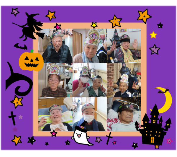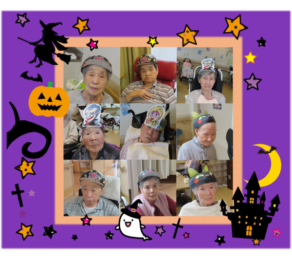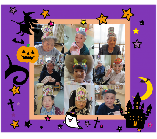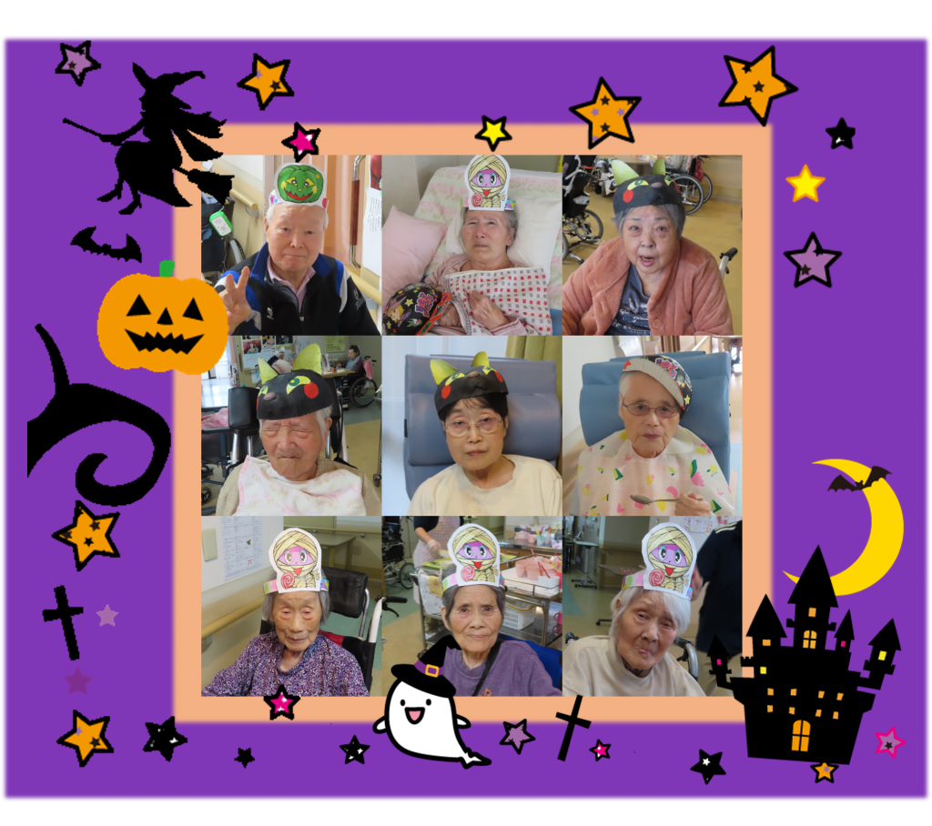 ハロウィンの行事食です。 ~ メニュー ~ チキンライス コンソメスープ 南瓜クリーム煮 アスパラサラダ チキンライスの上にもおばけ👻が登場 今年のハロウィンはお食事の時間に すこ~し仮装をしてハロウィン🎃の音楽で楽しい雰囲気の中 お食事をしましょう♪ということで みなさんにかぶっていただきました😁